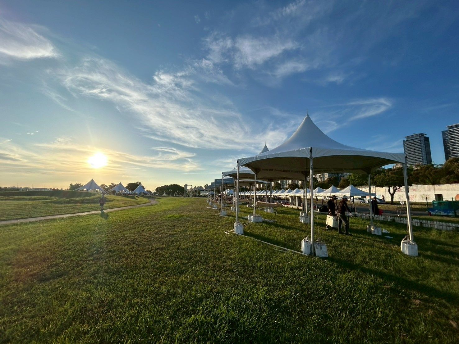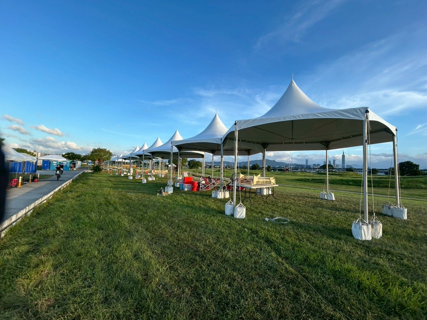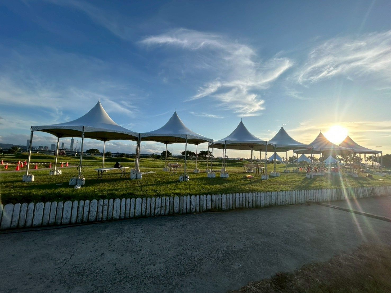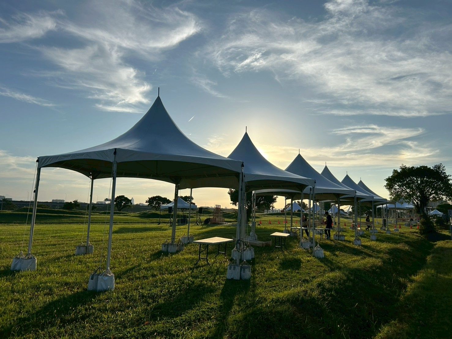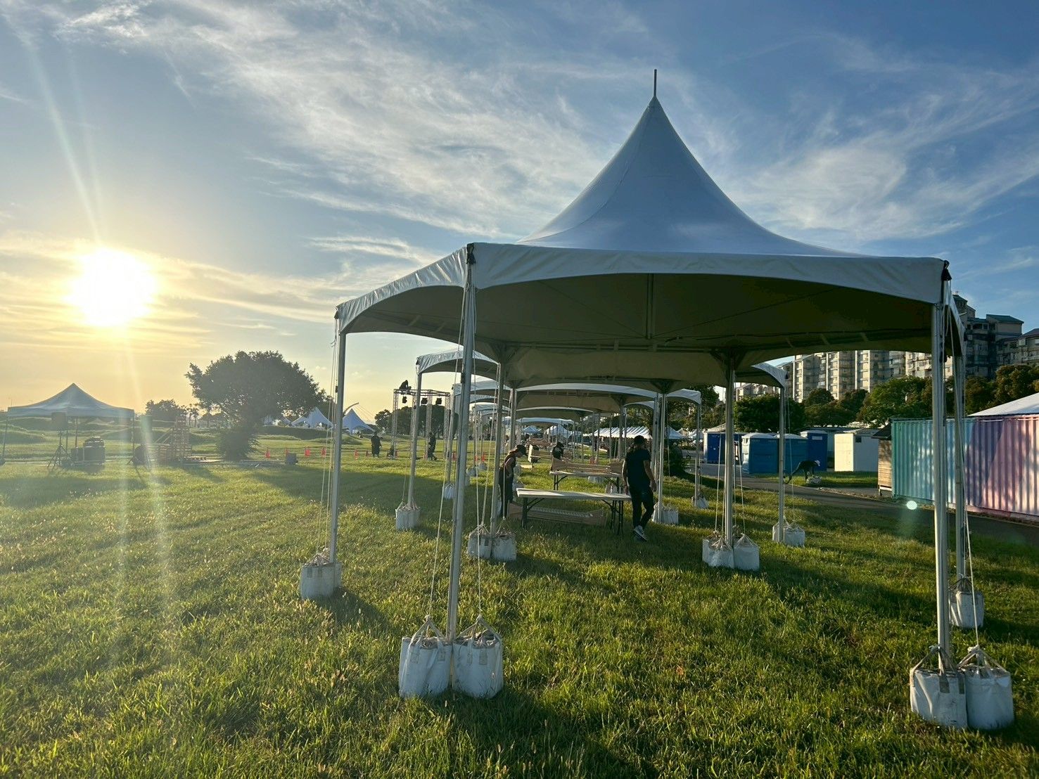 لدعم حدث خارجي كبير يُعقد في حديقة ضفاف النهر، قدمت شركة وين فونيكس خدمات تأجير الخيام السداسية، مما خلق مساحة للحدث تجمع بين الوظائف والجماليات. تتميز الخيام بهياكل من سبائك الألمنيوم وأغشية PVC عالية المتانة، مما يوفر مظهراً أنيقاً مع مقاومة ممتازة للرياح والمطر. سواء في النهار أو الليل، فإنها تقدم ملاذاً موثوقاً وتناسقاً بصرياً. تشكل الخيام المرتبة بشكل أنيق ظلالاً أنيقة تحت أشعة الشمس الغاربة، لتصبح نقطة جذب بصرية مميزة في المكان بأكمله.